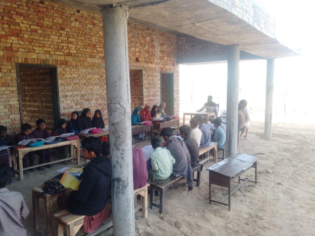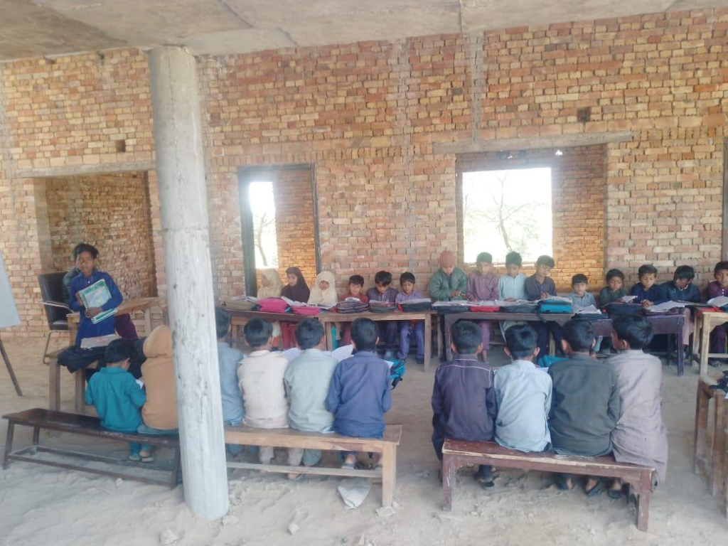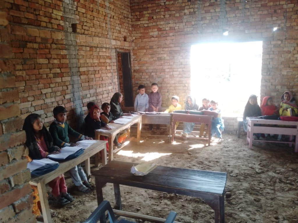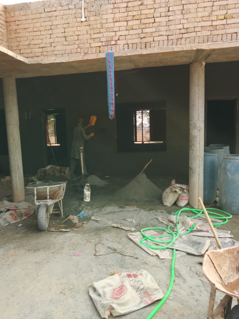 - The Under-construction Building: The construction of a 4300 sq ft covered area Elementary School on 4 kanals of land donated to Punjab Education Department is underway. The estimated cost of this project is Rs 15 million. Subject to availability of funds, this project will be completed ASAP. The Punjab Department Department’s Bahawalpur Office has assured of providing the staff and maintenance facilities for this school once it is completed. The Government of Punjab will be formally approached for Schedule of New Expenditure (SNE) for this facility. While its building is waiting to be completed, the school has shifted here with five teachers provided by the Punjab Literacy Department. Presently the work of plastering, floor, toilets, front boundary wall and windows/doors is being completed.